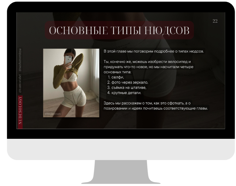 Это эстетичный красивый гайд по нюдсам от vanvorobei , называется NUDESOLOGY. Профессиональный крутой продукт на 100+ страниц, весь в картинках и примерах, позирование, предметы, силуэты, фокус, простым языком, а что в воде, а что со сложным светом, а что с полароидными снимками, а что с зеркалом, селфи, разными ракурсами. Добрый продукт, и навсегда вас избавит от переживаний, а какую фотку ему скинуть! Вдохновляющий.
