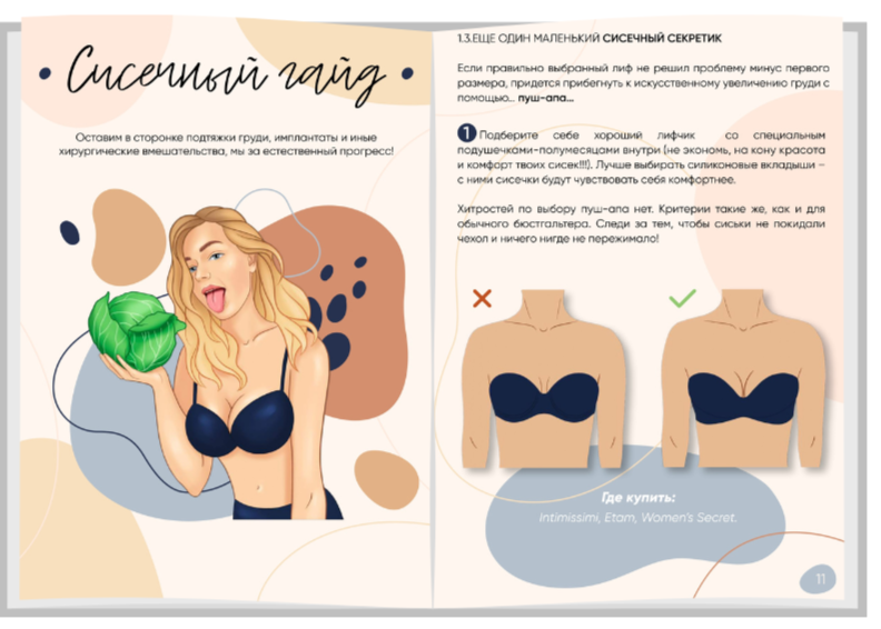 Это сисечный гайд от fitocaps! Легендарный, на 50 страниц. Про упражнения, самомассаж, сисечный мэйкап, еду и прочее. Он не про обожраться капустой, он про конкретные действия, которые у Юли сработали. От как подобрать лифчик и где его купить до как потереть грудь правильно! В общем, кто хочет попышнее - купите разведайте
